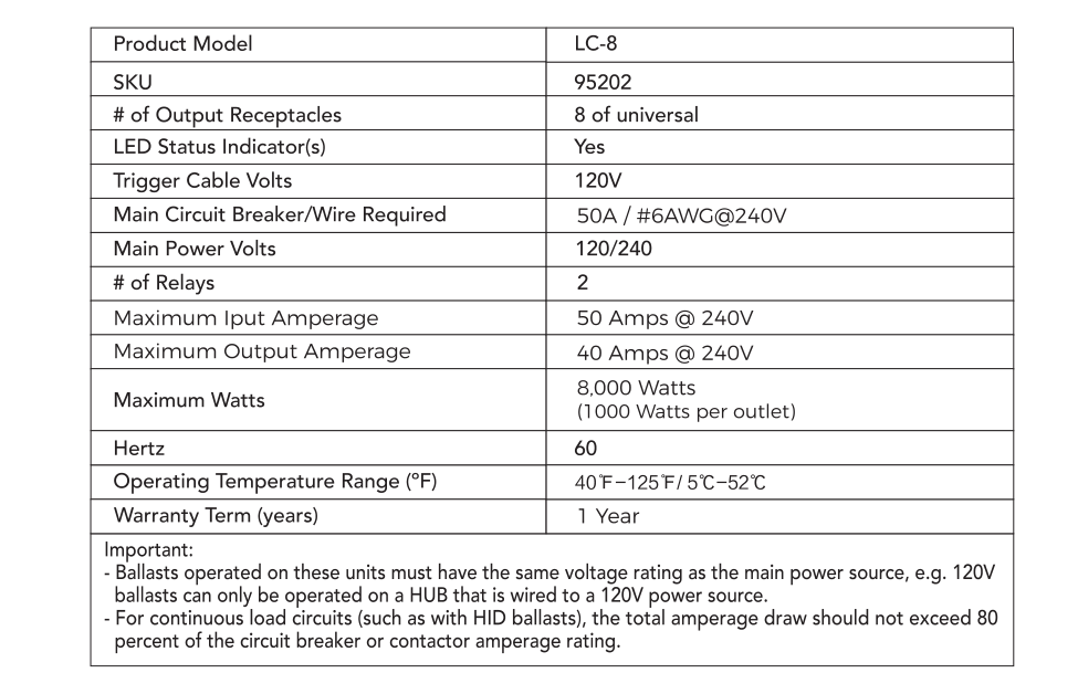 ♦ Use a voltage meter to verify the correct voltage BEFORE plugging ballasts into the LC-8. If connected to a 240V circuit, the voltage meter should read approximately 240V If connected to a 120V circuit, the voltage meter should read approximately 120V